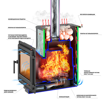 Конвекционно–вентилируемая облицовка, изготовленная из экологически чистой горной породы , который обладает большой теплоёмкостью, что позволяет камню в короткие сроки нагреваться и максимально долго удерживать стабильную температуру в парильном помещении, а также гасить жёсткое инфракрасное излучение Камень обладает исключительными лечебными свойствами: помогает при головных болях, при нестабильном артериальном давлении, при простудных заболеваниях, воспалительных процессах в почках и пищеварительной системе, снимает повышенную возбудимость и нервозность, сглаживает эмоциональные всплески. Облицовка из натурального камня при нагреве способна аккумулировать тепло, что гарантирует максимально равномерный прогрев и сохранение тепла Банная печь Легенда 22 Панорама "М" талькохлорит укомплектован чугунной каминной, самоохлаждаемой дверцей Везувий 505 с большим жаропрочным стеклом «SCHOTT ROBAX», с оборудованной системой самоочистки, что позволяет визуально контролировать горение и любоваться видом живого огня. Данная печь рассчитана на объем парильного помещения 12-24 м3.Дымоход и комплектующие