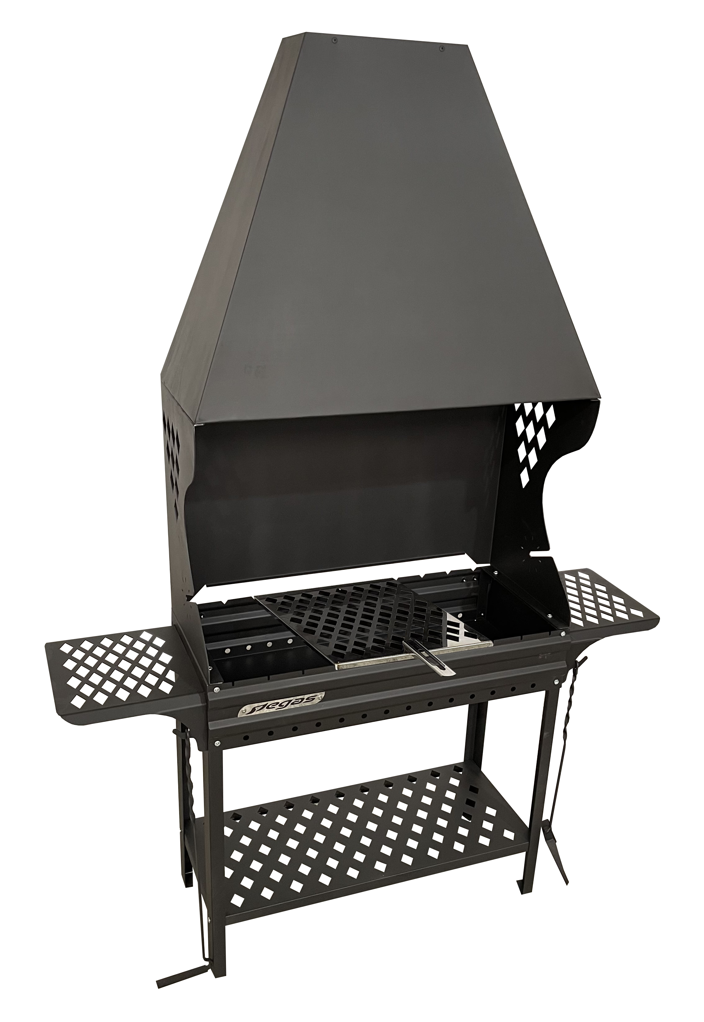 Особенностью мангала является внешний дизайнерский вид, съемные боковые столики, боковые отверстия обеспечивают оптимальный приток воздуха для поддержания горения и жара и углей.Нижняя полка позволяет удобно и компактно хранить все необходимые материалы и подручные средства..