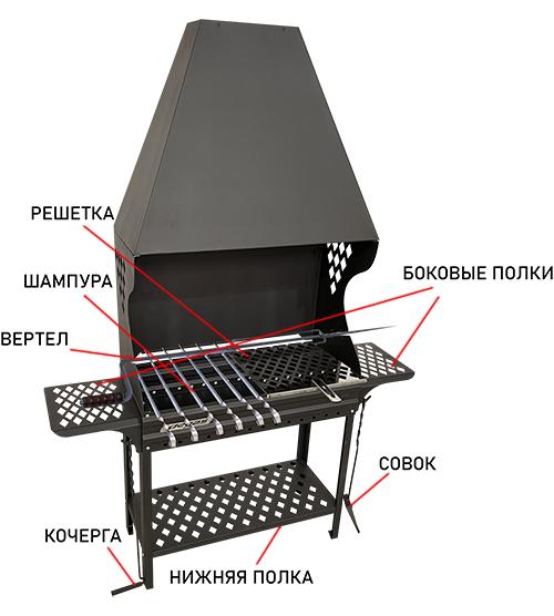 Мангал Пегас Фазенда укомплектован кочергой, совком, шампурами и вертелом.
